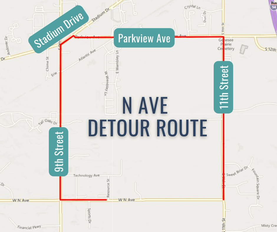 Please be advised that a portion of N Avenue, between 9th Street and 11th Street, will be closed for utility connection work starting on Monday, August 14. The closure and detour route will remain in effect until Friday, August 25th. Please see the below map for the detour route, which follows 9th Street, Stadium Drive, Parkview, and 11th Street. If you have any questions, please contact the Road Commission of Kalamazoo County at 269-381-3171.